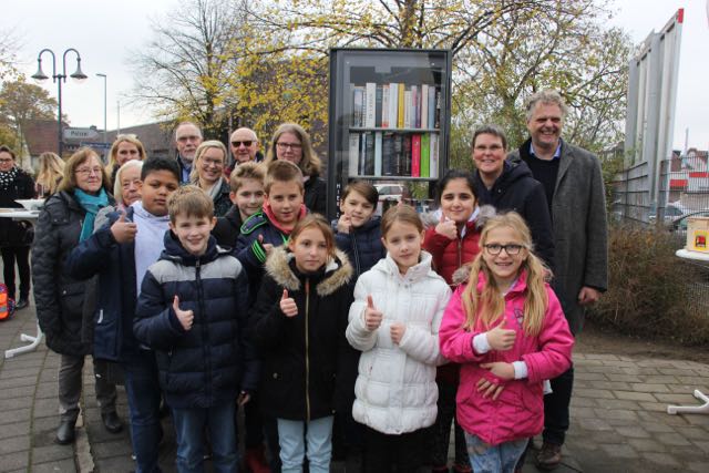 Die Kinder aus der 4a der Grundschule Avenwedde-Bahnhof jedenfalls nutzten gleich beim Einräumen die Gelegenheit zum Stöbern. Alina Luft, Neela Schmitz, Elissa Hassan, Jaro Wolf, Alexandra Retslav, Nikita Töws, Nuyan Kinik, Fabian Uhr, Noah Agyarey und Denny Schlecht sorgten außerdem für ein kleines Rahmenprogramm, denn sie hatten mit verteilten Rollen die Gedichte über den Herrn von Ribbeck auf Ribbeck im Havelland und die „Apfelkantate“ als kleine literarische Einstimmung einstudiert. Dazu gab es als „Catering“ Apfel- und Birnenstückchen für die zahlreichen Gäste. Zu ihnen gehörten auch die „Paten“, die in Zukunft dafür sorgen werden, dass Ordnung im „offenen Schrank“ herrscht. Für sie sprach Wolfgang Stitz vom Team des Avenwedder Bahnhofs und punktete mit einer Überraschung: Am Schrank wird eine Bank aufgestellt. Wer will, kann also gleich vor Ort mit dem Lesen beginnen.