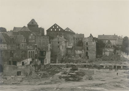 Foto: Hohn- und Scharnstr., 1948. Im Hintergrund sind die Martinikirche und das ausgebrannte Proviantmagazin zu sehen; © Mindener Museum