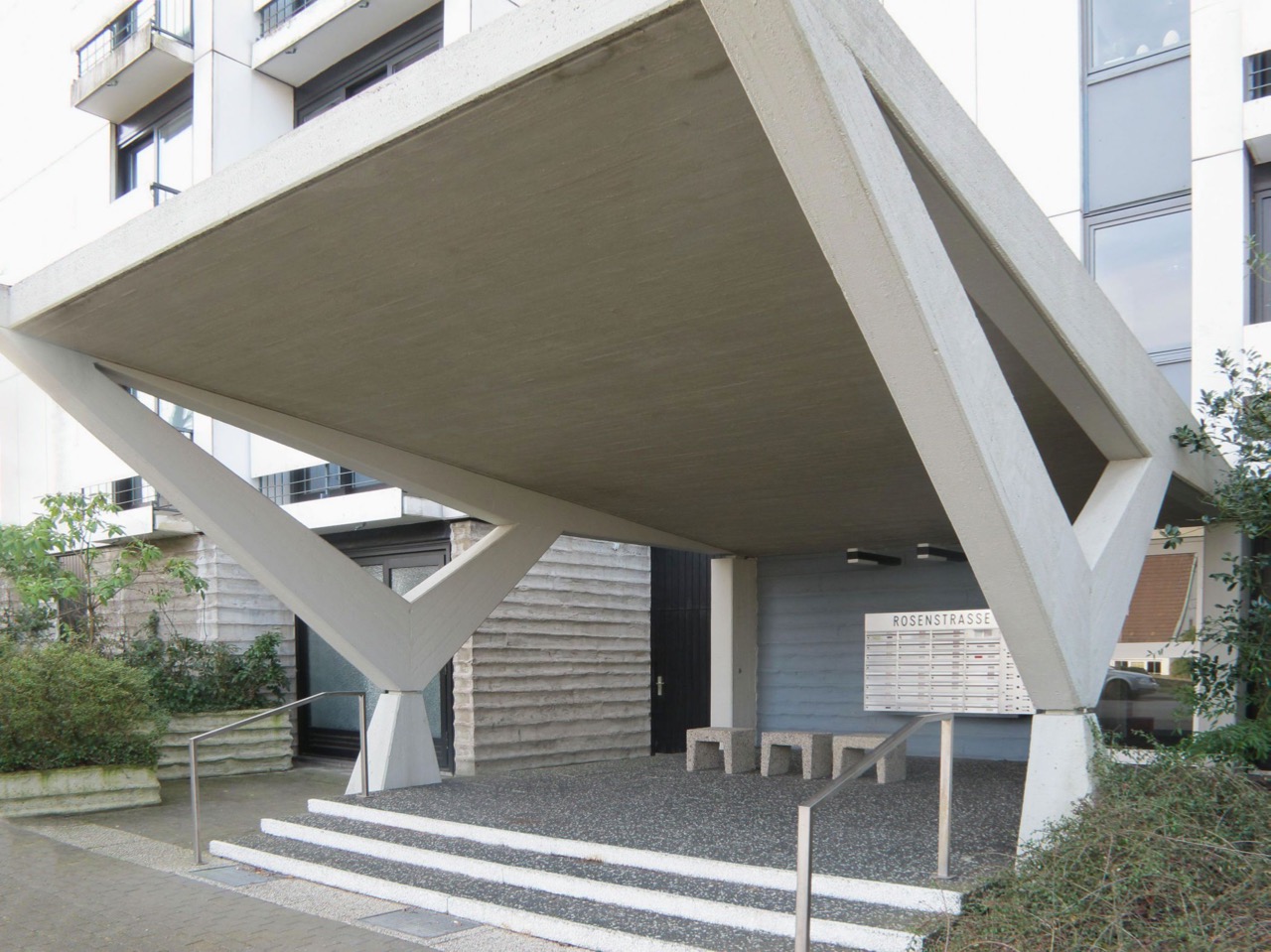 Die Detmolder Architektin Gertrud Enzensberger (1908-1995) und ihr Sohn Peter Junkers (*1936) haben das achtgeschossige Wohngebäude mit einem Staffelgeschoss und sechs Dachgärten für die „Baugemeinschaft Rosenstraße“ konzipiert. Das Gebäude ist ein Stahlbetonbau mit rhythmisch gegliederter Vorhangfassade aus weißen Faserzementplatten. Im optischen Gegensatz zu der glatten Fassadenoberfläche steht die raue, horizontal gerillte Betonstruktur der Sockelzone. Betonoberflächen zeigen auch die östlich angeschlossene Großgarage, die westlich angeordneten Gewerbebauten sowie die Pflanzbeet-Einfassungen.