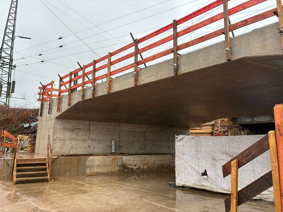 In den vergangenen Monaten haben die Fachleute das Brückenteil neben dem Bestandsbauwerk betoniert. Anfang März hebt ein Kran ein rund 112-Tonnen schweres SPMT-Fahrzeug („Tausendfüßler“) an die Brückenbaustelle. Der Tausendfüßler wird das Bauwerk aufbocken und in Millimeterarbeit in seine neue Position schieben. Zuvor bricht das Team hierfür die letzten zwei Bestandsbauwerke ab. Im Anschluss an den Einschub verlegt das Projektteam auf dem neuen Überbau rund 120 Meter neues Gleis und verbaut 300 Tonnen Schotter sowie 200 Schwellen. Zum Ende der einwöchigen Bauphase richtet das Projekt die Oberleitung wieder her, damit im Anschluss der Zugverkehr wieder über die Strecke rollen kann.