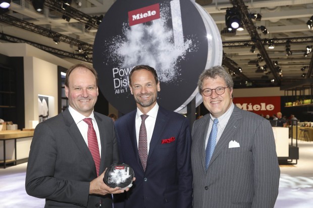Ungeahnte Freiheit dank AutoDos und PowerDisk: Auf der Miele-Pressekonferenz zur IFA präsentierten die Geschäftsführer Dr. Markus Miele, Dr. Axel Kniehl und Dr. Reinhard Zinkann (v. l.) den ersten Miele-Geschirrspüler, der autonom startet und dosiert.