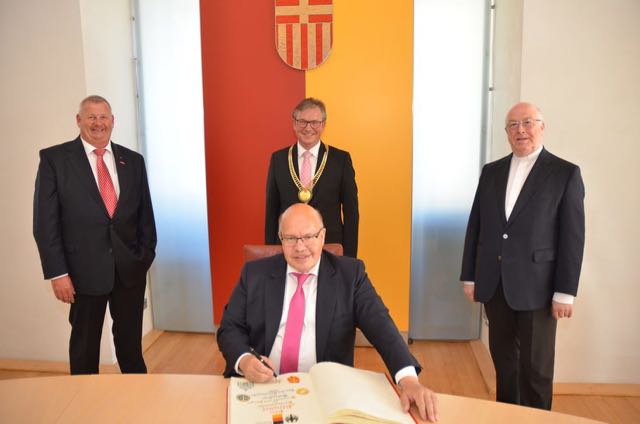 Paderborn. An der guten Tradition, dass sich der Festredner zum Tag des Handwerks in das Goldene Buch der Stadt einträgt, hat Bürgermeister Michael Dreier auch trotz der Corona bedingten Verlagerung des Liborifestes auf die digitale Ebene festgehalten. So begrüßte der Bürgermeister Wirtschaftsminister Peter Altmaier am Donnerstag, 30. Juli, im historischen Rathaus, in kleiner Runde. Im Beisein von Erzbischof und Generalvikar, stellvertretendem Landrat, Fraktionsvorsitzenden, städtischen Beigeordneten, der Führung der Kreishandwerkerschaft Paderborn-Lippe sowie heimischen Landtags- und Bundestagsabgeordneten aus Paderborn, trug sich Altmaier in das Goldene Buch der Stadt Paderborn ein.