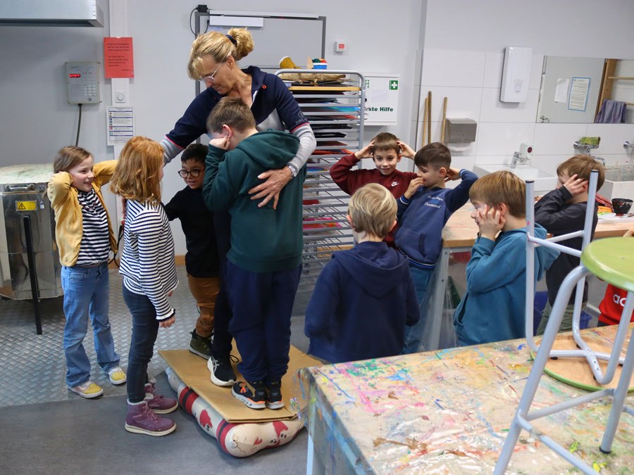 „Wer mag einen Luftballon für mich aufpusten?“, fragt Kursleiterin Katja Anstoetz in die Runde und findet sogleich zahlreiche freiwillige Schülerinnen und Schüler, die die bunten Gummihüllen bereitwillig mit einer Pumpe spielend leicht füllen und so die Grundlage für das erste Experiment des Vormittags legen. Katja Anstoetz sammelt Ballon für Ballon von ihren Helferinnen und Helfern ein, um sie dann in eine große Decke zustecken. „Heute schauen wir uns an, welche Kraft Luft entfalten kann“, erklärt die freiberufliche Naturpädagogin ihren Kursteilnehmern. Nachdem alle Ballons in der Decke verstaut sind, legt Anstoetz sie auf den Boden und platziert eine Pappe darüber. „Ob die Ballons uns wohl tragen können, wenn wir uns jetzt auf die Pappe stellen?“, fragt die Kursleiterin in die Runde. Und tatsächlich: Nach und nach holt Katja Anstoetz alle Kinder zu sich auf die Decke. Dicht gedrängt stehen sie, eng an eng auf der Decke und warten auf den großen Knall. Doch der bleibt aus. „Ganz schön stark, was die Luft alles tragen kann, oder?“, sagt Anstoetz.
