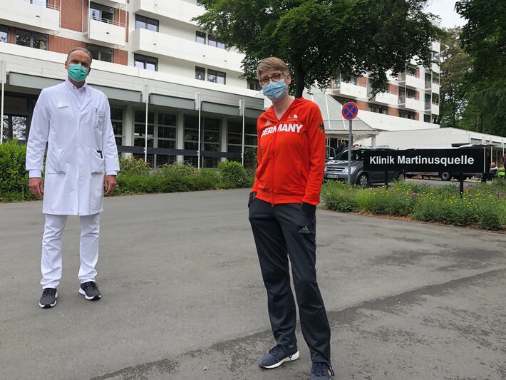 Die gleiche Begeisterung bringt Dr. Schipmann für seine prominente Patienten auf. „Neben der guten körperlichen Konstitution aufgrund des langjährigen Leistungssports war die positive persönliche Einstellung entscheidend für den ganz tollen Heilungsverlauf“, stellt der Chefarzt der Klinik Martinusquelle heraus. Franziska Liebhardt hat aktuell zwar keine Rückkehr in den Leistungssport geplant, möchte sich aber mit dem Handbike und beim Bergsteigen weiter fit halten. Zudem ist das vielfältige Engagement für die Organspende eine echte Herzensangelegenheit für sie.