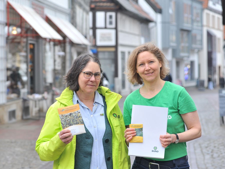 Für blühende Landschaften: Alexandra Melzig und Claudia Viotto (v. l.) zeigen die Regio-Saatgut-Packungen.Foto: BUND Lippe
