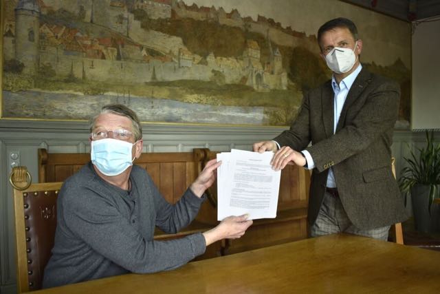Große Freude über die Bundesförderung: Landrat Michael Stickeln (r.) und Dr. Andreas Knoblauch-Flach, Leiter der VHS Diemel-Egge-Weser, mit dem Förderbescheid über rund 600.000 Euro. Mit dem Geld wird in den kommenden drei Jahren das Projekt „Smarte Gesundheits- und Pflegeversorgung für ländliche Räume“ finanziert. Foto: Kreis Höxter