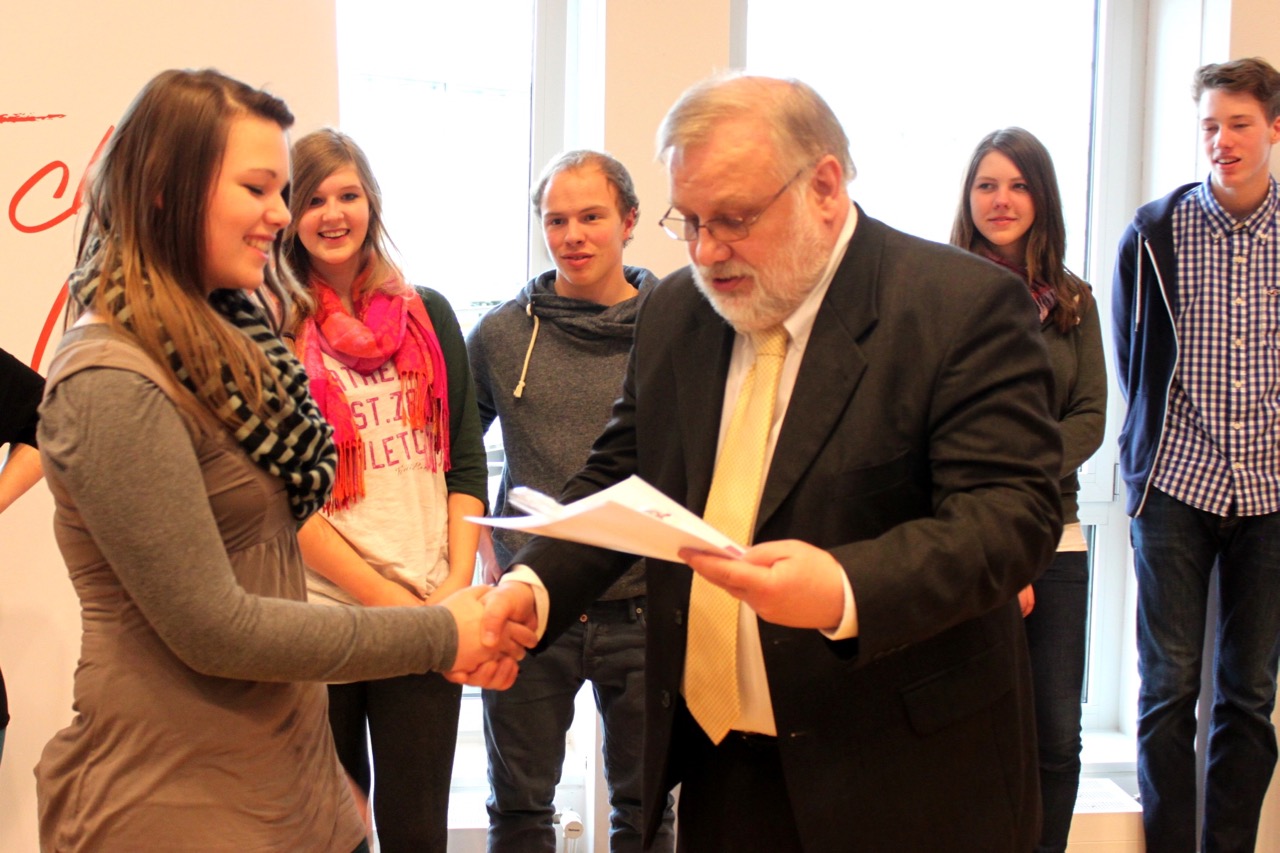 Motivation durch Belohnung. Die Schülerinnen und Schüler des Schulsanitätsdienstes der Eduard-Hoffmann-Schule freuen sich im Jahr 2013 über die Auszeichnung durch Beiratsvorsitzenden Jörg Herrmann.