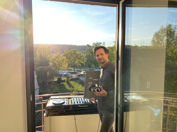 Büren. „Less Illness – More Music“ – unter diesem Motto hat David Haupt sechs Wochen lang täglich auf seinem Balkon in den Bürener Almeauen aufgelegt. Die notwendigen Schutzmaßnahmen gegen die Ausbreitung des Corona-Virus haben uns alle hart getroffen,“ berichtet er. „Veranstaltungen und Feste, aber auch der alltägliche Kneipenbesuch waren in den ersten Wochen gar nicht möglich und sind bis heute stark eingeschränkt.“ Trotzdem wollte der Bürener Unternehmer das Beste aus der Situation machen und fing getreu der Devise „Musik verbindet“ an, anderen durch seine Balkonmusik eine Freude zu machen. In seiner täglichen musikalischen Session spielte er unter Beachtung der Corona-Auflagen für Nachbarn, Spaziergänger und eine immer größer werdende Internetgemeinde über 44 Tage lang ein abwechslungsreiches Kurzprogramm.