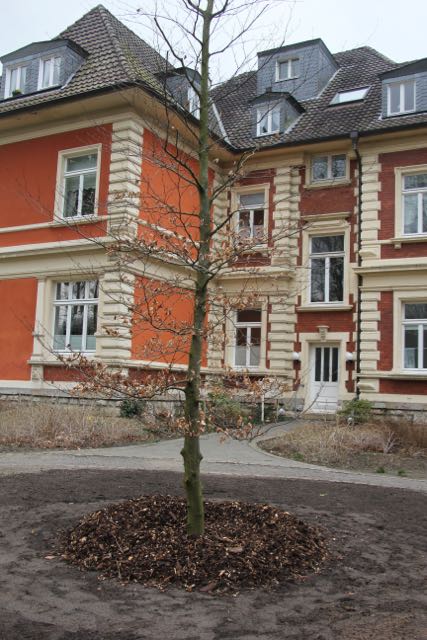 Dort ist jetzt ein neuer Baum gepflanzt worden. Es handelt sich um eine rotlaubige Buche (Blutbuche), die von einer Baumschule aus der Nähe geliefert wurde. Der Baum hat einen Stammumfang von circa 40 cm, eine Höhe von 8 m und ist circa 20 Jahre alt. In den nächsten drei Jahren muss er bei Trockenheit noch gewässert werden. Dann ist er dauerhaft angewachsen und wird die kommenden Stürme überstehen. Bis er die Größe seines Vorgängers erreicht, werden aber noch einige Jahrzehnte vergehen…