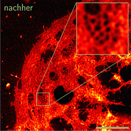 Herkömmliche Lichtmikroskopie kann nur eine definierte untere Auflösungsgrenze erreichen, die durch die Beugung des Lichts auf circa 1/4 eines Mikrometers beschränkt ist. Die hochauflösende Fluoreszenzmikroskopie ermöglicht es, Bilder mit einer Auflösung deutlich unter dieser physikalischen Grenze zu erhalten. Für die Entwicklung dieser für die biomedizinische Forschung wichtigen Schlüsseltechnologie wurden die Physiker Stefan Hell, Eric Betzig und William Moerner 2014 mit dem Nobelpreis ausgezeichnet. Aktuell nutzen Forschende in diesem Bereich unter anderem die strukturierte Beleuchtung, um eine erhöhte Auflösung zu erzielen. Dies ist momentan eines der am weitesten verbreiteten Verfahren, um dynamische Prozesse in lebenden Zellen darzustellen und abbilden zu können. Diese Methode erreicht eine Auflösung von 100 Nanometern mit hoher Bildrate, gleichzeitig werden die Proben beim Messen geschont. Diese Methode der hochauflösenden Fluoreszenzmikroskopie wird auch in der Arbeitsgruppe Biomolekulare Photonik an der Bielefelder Fakultät für Physik erfolgreich eingesetzt und weiterentwickelt, zum Beispiel um die Funktion der Leber oder Ausbreitungswege des HI Virus zu untersuchen.