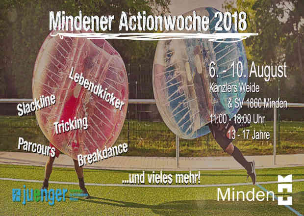Minden. In der vierten Sommerferienwoche gibt es in Minden ein ganz neues Angebot für Kinder und Jugendliche: die Mindener Actionwoche. Hier können 13- bis 17-Jährige Bumper Ball spielen, am Weserstrand chillen, eine eigene Hängematte basteln oder Bogenschießen. Tanzen und Musik machen sind bereits in der Planung. Das Programm wird gemeinsam mit den teilnehmenden Jugendlichen gestaltet. Die Actionwoche geht am 6. August los. Bis zum 10. August gibt es täglich von 11 Uhr bis 18 Uhr auf dem Gelände des SV 1860 Minden (Brückenkopf 14, Minden) Neues zu erleben.