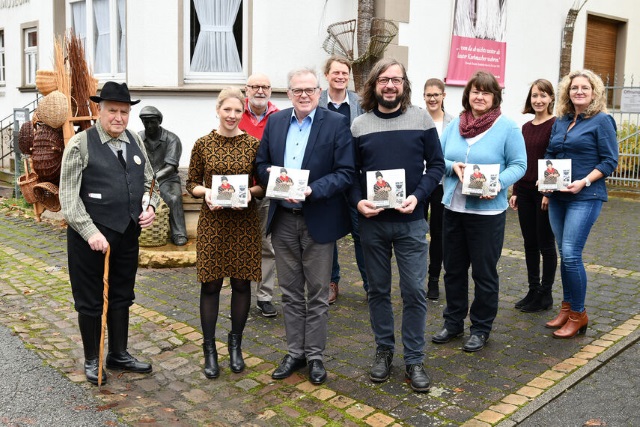 Stellten im Korbmachermuseum in Dalhausen das neue Jahrbuch des Kreises Höxter vor: (v. l.) Gerhard Ewerling als „Korbmacher mit Rief“, Kulturmanagerin Bernadett Walker (Kreis Höxter), Jürgen Böker (Heimatverein Dalhausen), Kreisdirektor Klaus Schumacher, Verleger Jörg Mitzkat, Korbmachermeister Hansgert Butterweck, Sandra Zengerling (Kreis Höxter), Korbmachermeisterin Ursula Butterweck, Kreisarchivarin Kathrin Helm und Kristin Wiechers (Kreis Höxter). Foto: Kreis Höxter