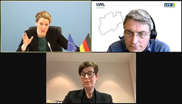 Bundesfamilienministerin Franziska Giffey (o.l.), LVR Jugend-dezernent Lorenz Bahr (o.r.) und LWL-Jugenddezernentin Birgit Westers (u.) diskutierten bei der Sondersitzung der Jugendamtsleitungen aus NRW die zentralen Reformaspekte des Gesetzentwurfes online.