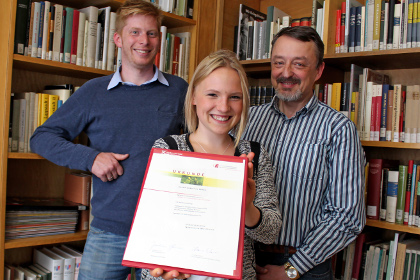 Stolz zeigt Landessiegerin Laura Christine Frank ihre Urkunde. Geschichtslehrer Johannes Leiskau (links) und Stadtarchivar Stephan Grimm haben die 17-Jährige bei ihrer Forschungsarbeit über Wilhelm Florin unterstützt; ©Stadt Gütersloh