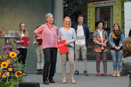 Laura Christine Frank (rechts) nimmt ihren Landespreis beim Geschichtswettbewerb des Bundespräsidenten von Ulla Lachauer entgegen; ©Stadt Gütersloh