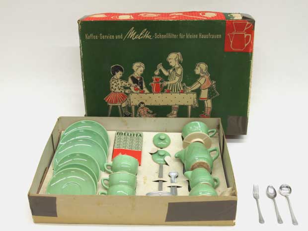 Das Kinderservice der Firma Melitta bekam die Leihgeberin im Alter von etwa zehn Jahren Ende der 1950er Jahre zu Weihnachten geschenkt. Damals spielten sie und ihre Freundin noch viel mit Puppen, bauten ihnen im Schuppen ein Wohnzimmer und stellten das Familienleben nach. Es gab auch eine Kaffeestunde, alltags mit Plastikgeschirr, nur sonntags wurde das „gute Melitta-Service“ hervorgeholt. Es war für die Mädchen ein tolles Gefühl, wenn sie ihren „Kaffee“ selbst filtern konnten. Meistens waren es kaffeeähnliche Getränke wie „Muckefuck“ oder auch nur Milch oder Wasser. Hauptsache, es konnte gefiltert und dann getrunken werden.