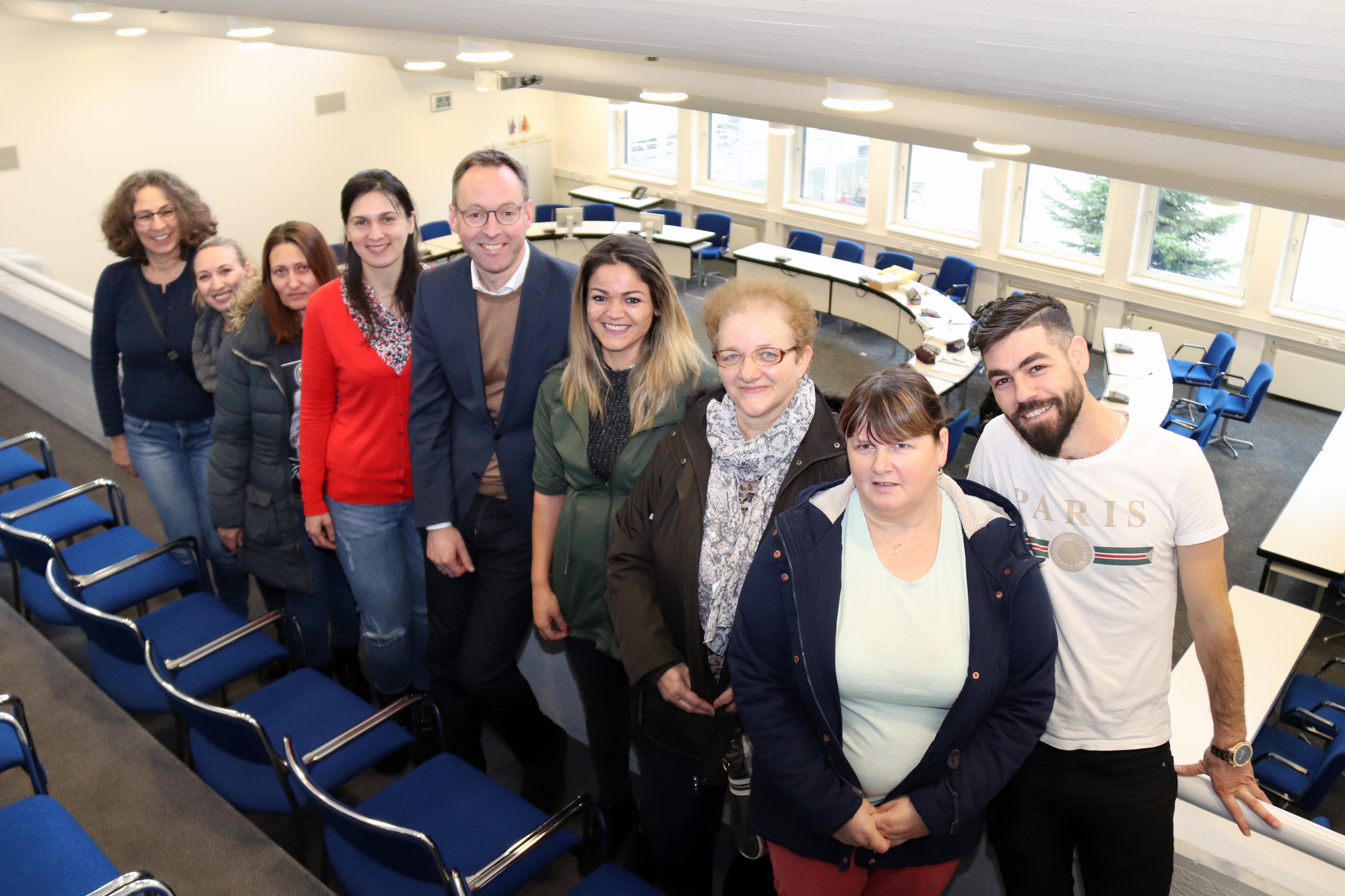 BU: (v.l.) Kursleiterin Jaqueline Siebigs, Elena Constantin, Dimka Jovanova, Cosmina-Nicoleta Gliga, Bürgermeister Theo Mettenborg, Sengül Kulan, Marija Antunović. Alicja Pätsch und Badrkhan Almustafa. © Stadt Rheda-Wiedenbrück