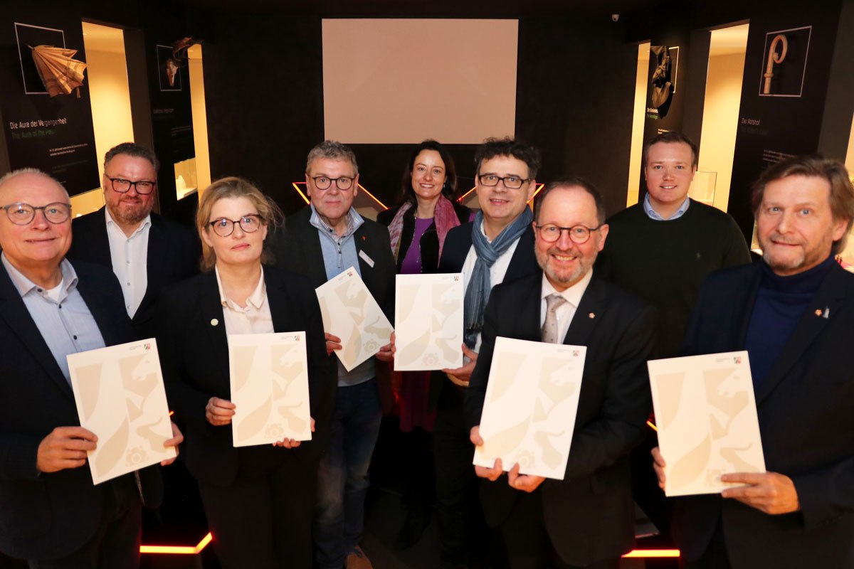 BU: Erhielten die Förderbescheide von Regierungspräsidentin Anna Katharina Bölling (Mitte): (v. l.) Hans-Bernd Janzen (stv. Landrat des Kreises Paderborn), Björn Böker (Geschäftsführer OWL GmbH), Dörte Pieper (Geschäftsführerin Naturpark Teutoburger Wald/Eggegebirge), Meinolf Haase (Landrat des Kreises Lippe), Thorsten Brinkmann (Geschäftsführer GILDE GmbH), Jörg Düning-Gast (Verbandsvorsteher Landesverband Lippe), Michael Ruttner (Bürgermeister Horn-Bad Meinberg) und Günter Weigel (Geschäftsführer Lippe Tourismus und Marketing GmbH). (Foto:Bezirksregierung Detmold)