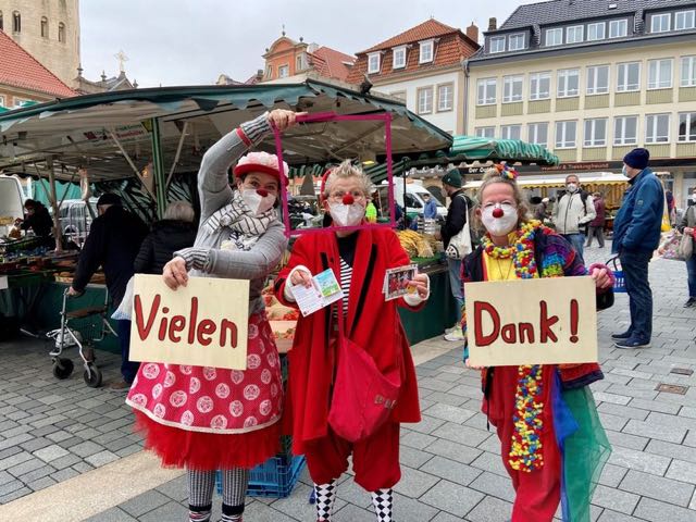 „Wir freuen uns, dass wir auf dem Wochenmarkt unterwegs sein durften, um die Menschen ein wenig zu beglücken und zum Lachen zu bringen“, erzählt Kontaktclownin Paula.