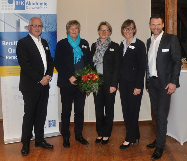 Freuen sich über das 10-jährige Jubiläum: (v. l.) Festredner Markus Zeyen, Geschäftsführer Melitta Zentralgesellschaft mbH & Co. KG, Moderatorin Corinna Müterthies, Stephanie Thieheuer, Regionalverantwortliche der IHK-Akademie für den Mühlenkreis, Ute Horstkötter-Starke, Geschäftsführerin IHK-Akademie Ostwestfalen GmbH, André Fechner, Geschäftsführer des Arbeitgeberverbandes Minden-Lübbecke e. V.