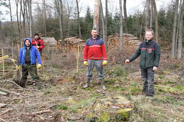 Förster Thomas Fritzemeier (r.) bedankt sich bei den Mitarbeitern der Forstbaumschule AFS für die Pflanzung des Laubholzes im Bürgerwald
