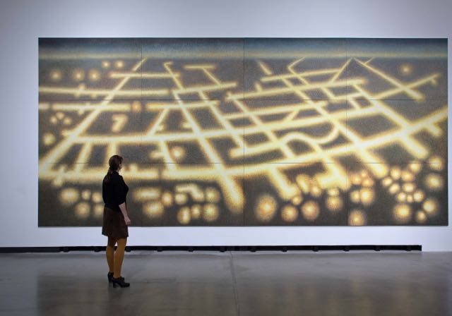 Ausstellungsansicht: Silke Silkeborg, Beleuchtung der Welt, 2015 – 2018, Leinwand aus 12 Panelen, 360 x 800 cm, Foto: Hans Schröder © VG Bild-Kunst, Bonn 2019