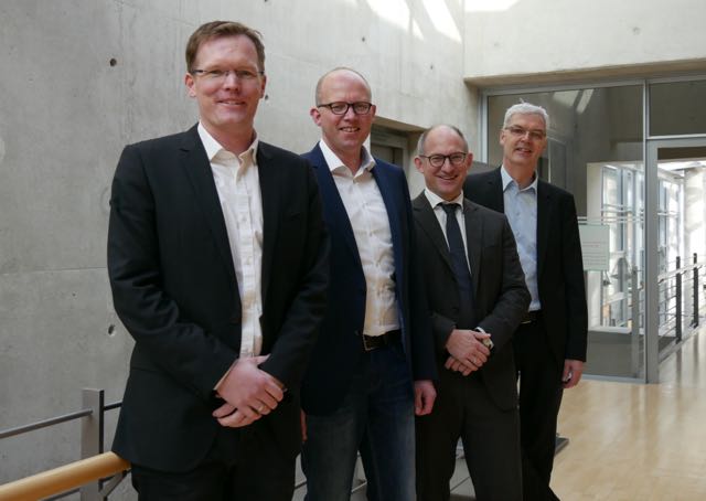 Informierten über zukünftige digitale Entwicklungen des Bauens (v. l.): Markus Brune und Maik Stodieck (beide GNUSE Ingenieurbüro für Krankenhaustechnik GmbH & Co. KG), Prof. Dr.-Ing. Michael Eisfeld (Fachhochschule Bielefeld) und Albrecht Pförtner (Geschäftsführer pro Wirtschaft GT GmbH).