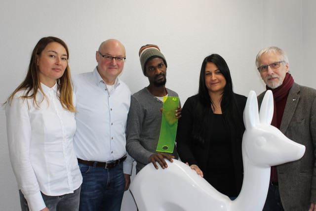 (von links): Tatiana und Mathias Schulenberg (Prof. Lauermann Design GmbH); Produktionshelfer Aliou Bah; Selen Saner (Agentur für Arbeit Detmold); Rudolf Obermeier (Industrie- und Handelskammer) Lippe zu Detmold