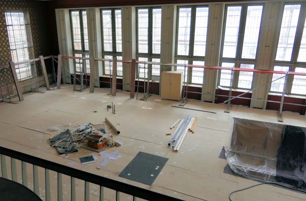 Auch im Inneren des um 1260 errichteten, historischen Rathauses tut sich Einiges. Der Kleine Rathaussaal ist innen vollkommen eingerüstet. Der Große Saal wird derzeit ebenfalls für die umfassende Sanierung vorbereitet. „Hier wird eine Kühl-/Heizdecke eingebaut, die die Nutzung des historischen Saales vor allen in den Sommermonaten deutlich verbessern wird “, so Stadtkämmerer Kresse. Das sei sehr aufwändig, weil die jetzige Decke dafür abgesenkt werden muss, am Ende aber genauso wieder aussehen muss wie im Original, erläutert er. Im weiteren Rundgang wird deutlich, wie umfassend und auch kompliziert die Maßnahme ist. „Bauen im Bestand ist immer schwierig und Überraschungen sind vorprogrammiert“, so Kresse.