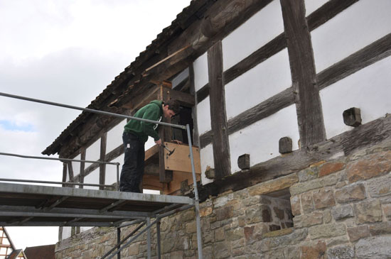 BU: Der Auszubildende Jonas Stickan rekonstruiert den Aborterker am Kornspeicher aus Etteln im Paderborner Dorf des LWL-Freilichtmuseums Detmold.