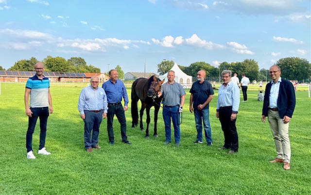 Der Vorsitzende des Rennvereins Drensteinfurt, Klaus Storck (zweiter v.l), freut sich auf das Event am kommenden Sonntag im Erlfeld , Foto: Klaus Ottenberg