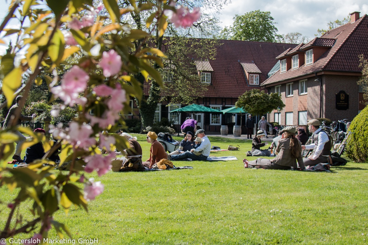 Hier wurde bei der Klosterpforte Rast gemacht und die Gelegenheit für eine Tea Time genutzt. „Wir sind begeistert, dass der Gütersloher Tweed Run mittlerweile einen so guten Ruf weit über Gütersloh hinaus hat und freuen uns jetzt schon auf den 5. Gütersloher Tweed Run im nächsten Jahr“, so Jan-Erik Weinekötter, Geschäftsführer der gtm. Zum Abschluss des Tweed Run wurden am Stadtmuseum die schönsten Outfits, Frisuren und Fahrräder prämiert.