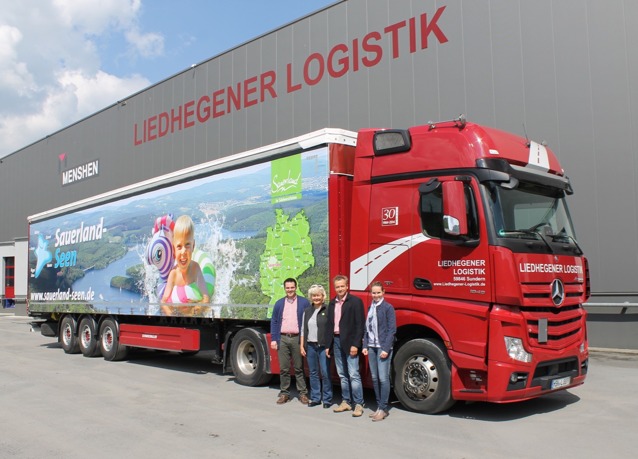 Sauerland. Fröhlich-frisch leuchten den Verkehrsteilnehmern schon von Weitem die großformatigen Fotos der heimischen Talsperren entgegen und machen Lust auf einen Sprung ins kühle Nass: Denn ab sofort rollt ein neuer LKW-Auflieger der Spedition Liedhegener aus Sundern, bedruckt mit ausgewählten Motiven der Sauerland-Seen, als Markenbotschafter quer durch die ganze Bundesrepublik.