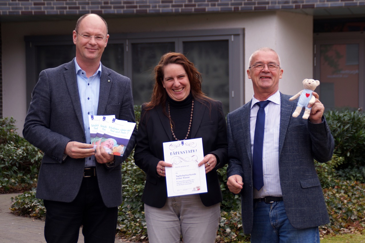 (v.l.) Pflegedirektor Jens Alberti, Geschäftsführerin Maud Beste und Dr. Burghard Lehmann, Geschäftsführer der Familie-Osthushenrich-Stiftung, präsentieren die neue Broschüre sowie die Tapferkeitsurkunde und den Teddy, den jedes Kind nach einer Operation im Klinikum Gütersloh oder im ambulanten OP-Zentrum zukünftig bekommt.