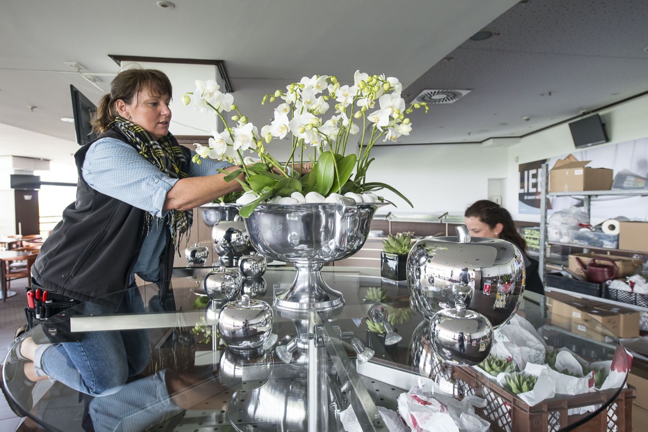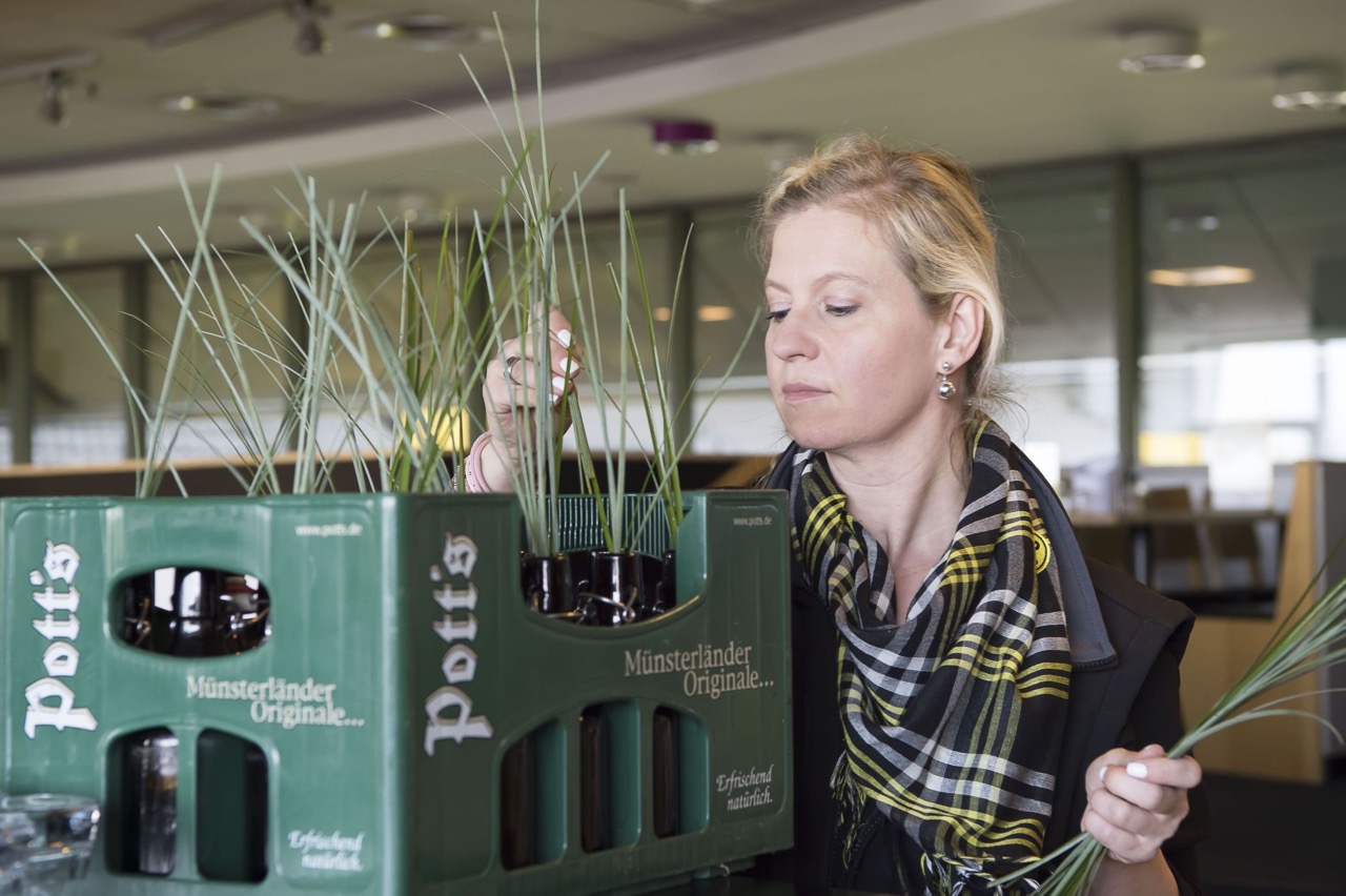 Katharina Wodrich arrangiert im ersten VIP-Raum silberne Kugeln, Töpfe mit Orchideen und Sukkulenten auf einem Buffet, während die Catering-Leute Tische und Stühle an den richtigen Platz rücken. Im Nebenraum nimmt sich Stefanie Salewski die Bierflaschen vor: Sorgfältig zupft sie ein paar lange Grashalme aus dem Bund in ihrer linken Hand und stellt sie in eines der Gefäße, dazu steckt sie eine gelbe Gerbera. Als alles fertig ist, treffen sich die Floristinnen noch zum gemeinsamen Foto auf dem Zuschauerrang – dann fährt das Team zurück nach Waltrop.