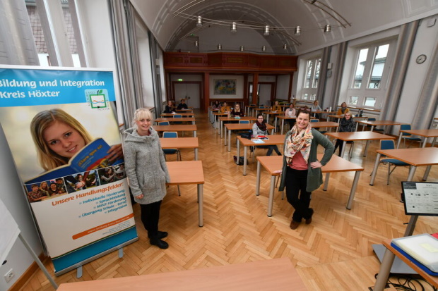 Sarah Mönnekes (links) und Referentin Yvonne Ungerer begrüßten die Teilnehmerinnen und Teilnehmer zur letzten Sitzung des Heidelberger Interaktionstrainings im Kreishaus in Höxter. Das Foto entstand vor der Verschärfung der Corona-Schutzmaßnahmen. Foto: Kreis Höxter