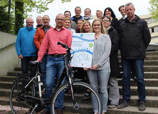 Foto: Laden dazu ein, die Freude am Radeln zu entdecken: Laureen Falke und Jürgen Deppemeier mit Vertretern der 16 Kommunen, die zusammen mit dem Kreis am Stadtradeln teilnehmen © der Veranstalter