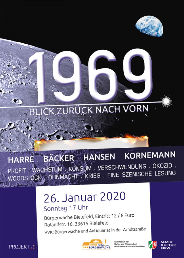 Nur 50 Jahre später verschatten Umweltzerstörung, die Verschwendung von Ressourcen und ungezügelte Industrieproduktion den Zukunftsoptimismus. Wachstum, Konsum und Profit stehen als quasi-religiöse Ideologie ebenso in Frage, wie Technologien und politische Systeme. Aus der Zukunft reist die Crew von Projekt.: 1969 in die Vergangenheit. Ihr Blick aus dem All zeigt die Verletzlichkeit des Heimatplaneten und entdeckt eine spannende Zeit. Projekt.: Matthias Harre – Text, Audio/Video, Regie Josef Bäcker – Stimme & Spiel Jörg Hansen – Schlagzeug, Stimme & Spiel Aiga Kornemann – Stimme & Spiel