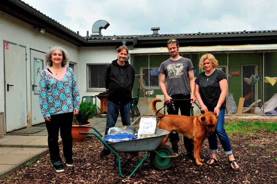 Barbara Düsterhöft (von links) von der Rödinghauser Gemeindeverwaltung und Nicolas Bröggelwirth von der Herforder AutorInnen-Gruppe übergaben eine Schubkarre voll mit Tierfutter an Christian Metz, Hund Nelson und Tierheimleiterin Kathrin Sander.Foto: Gemeinde Rödinghausen