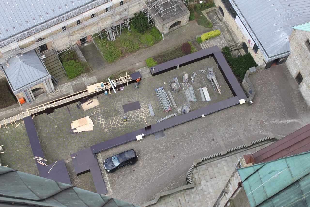 Niklas Hodel, Mitarbeiter des Museums in der Kaiserpfalz, hatte Gelegenheit, die Baustelle aus der oberen Etage des Domturms zu fotografieren: Mit dunkelbraunem Holz verkleidet zeigt sich die karolingische Pfalzanlage.