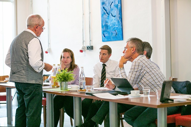 Udo Strakerjahn erklärt den Teilnehmern seine 6 – Step Innovationsmethode . Keine zufälligen Ideen unter der Dusche, sondern systematische Anwendungen spe zieller Analyse – und Entwicklungs-