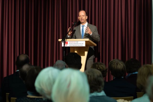 Unter der Schirmherrschaft des Aussiedlerbeauftragten des Landes NRW, Heiko Hendriks, fand der diesjährige Jahresempfang des Museums für russlanddeutsche Kulturgeschichte statt, dem zahlreiche politische Würdenträger aber auch Verantwortungsträger zivilgesellschaftlicher Organisationen beiwohnten. Dabei hielt der Beauftragte der Bunderegierung, Prof. Dr. Bernd Fabritius den Festvortrag. Er ging insbesondere darauf ein, dass es das Kriegsfolgeschicksal dieser deutschen Gruppe sei, welches Verantwortung für die Bundesrepublik nach sich zöge. Verantwortung, die auch dadurch übernommen werden solle, dass ein Haus wie das des Museums für russlanddeutsche Kulturgeschichte auch perspektivisch als Lern- und Erfahrungsort finanziell gesichert werden müsse. Nicht zuletzt in Kenntnis der Situation und Potenziale anderer Häuser dieser Ausrichtung stufte der Aussiedlerbeauftragte das Angebot am Detmolder Museum als gesellschaftlich hochrelevant ein. Der Beauftragte betonte die gesamtdeutsche Bedeutung des Museums: „Ich wünsche mir, dass das Museum noch stärker in die gesamtdeutsche Gesellschaft hineinwirkt, über die Geschichte der Deutschen in und aus Russland aufklärt und so letztlich zum Abbau von falschen Einschätzungen und zum Aufbau eines wertschätzenden Respekts beiträgt.“