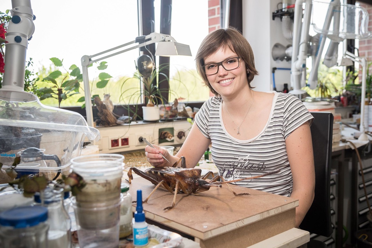 Die Präparationstechnische Volontärin Elena Peter stellte das Modell der Amerikanischen Kiefernwanze für die neue Ausstellung „Vom Kommen und Gehen“ her.