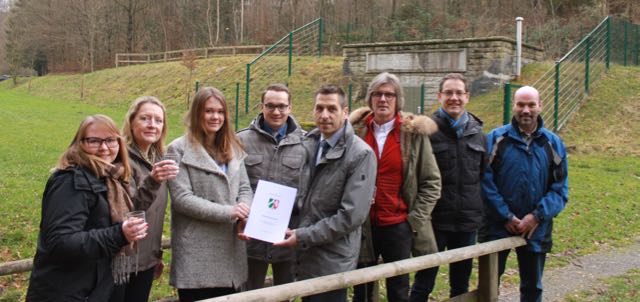 Bildzeile: Nun ist es amtlich: Die Stadt Büren darf weiterhin Wasser aus den Leibergquellen entnehmen. Patrizia Fitzner, Barbara Späth, Antonia Weskamp und Ronny Abraham von der Bezirksregierung Detmold übergeben Bürgermeister Burkhard Schwuchow, Thorsten Bürckner (Vorsitzender des Betriebsausschuss für Wasser und Abwasser), Ralf Müntefering (kaufmännische Betriebsleitung Wasserwerk) und Wassermeister Erich Müller den Bewilligungsbescheid.