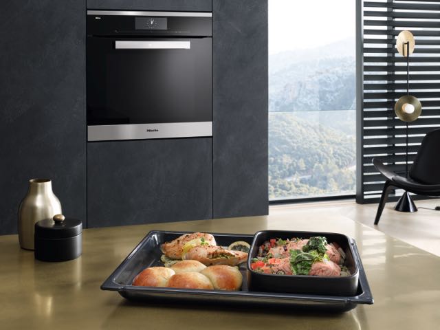 „Hauptdarsteller“ bei Miele auf der Eurocucina 2018: der neue Dialoggarer revolutioniert das Backen, Braten und Garen. Speisen von unterschiedlicher Textur und traditionell anderen Ansprüchen an die Zubereitung können gemeinsam gegart werden.