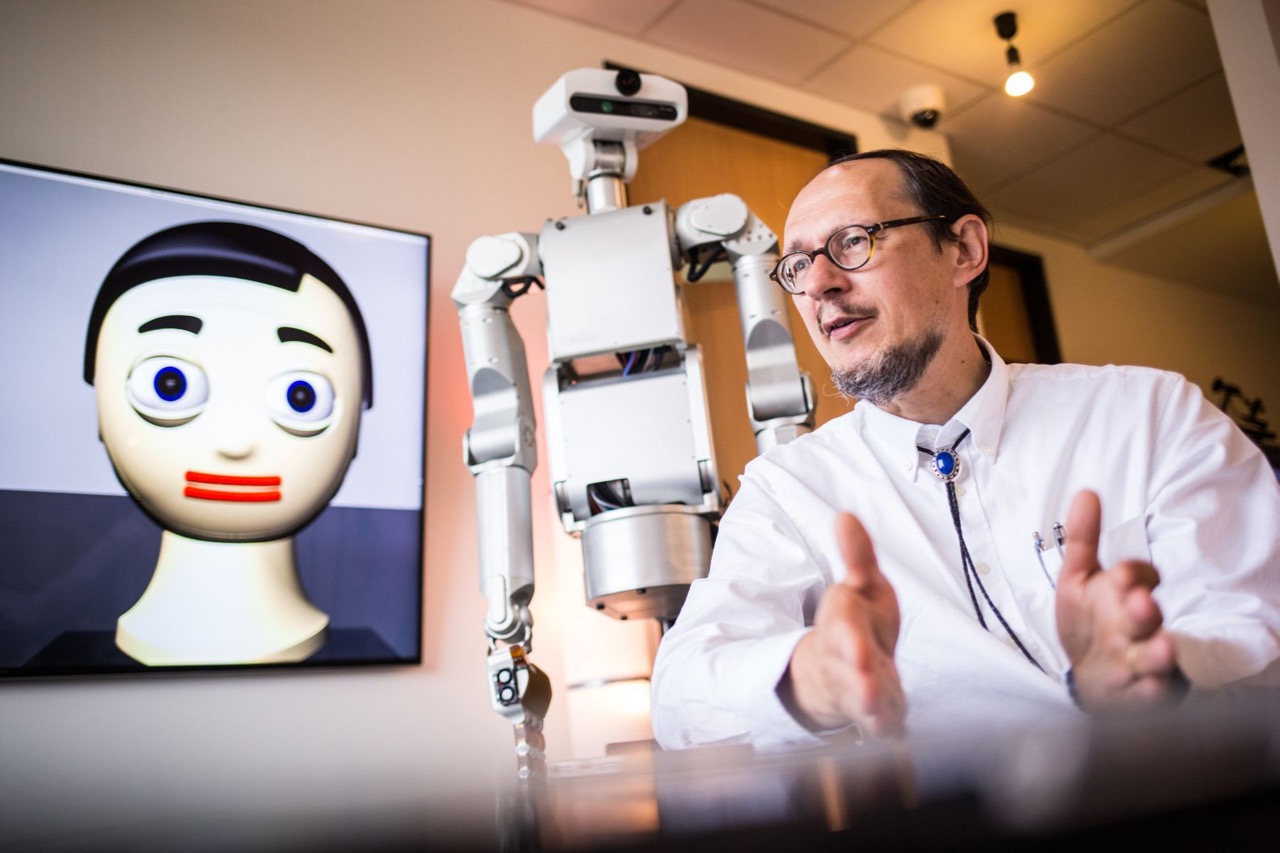 Prof. Dr. Helge Ritter (Universität Bielefeld) forscht unter anderem dazu, wie Wohnen und Leben durch Technik komfortabler und selbstbestimmter werden können. Im Hintergrund: Avatar Billie, der Menschen bei der Planung der Tagesabläufe unterstützt.