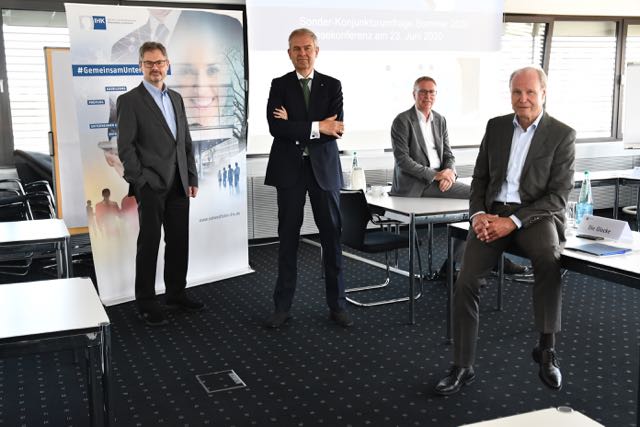 Präsentierten die Ergebnisse der Sonderkonjunkturumfrage und die Auswirkungen der Corona-Pandemie für die Industrie: IHK-Geschäftsführer Dr. Christoph von der Heiden, IHK-Präsident Wolf D. Meier-Scheuven, stv. IHK-Hauptgeschäftsführer Harald Grefe und IHK-Hauptgeschäftsführer Thomas Niehoff (v.l.), Foto: IHK