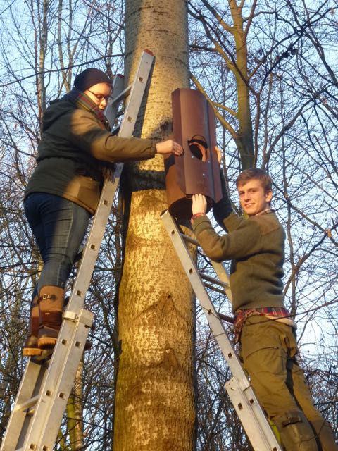 - P1020951.JPG: Die Bundesfreiwilligen Frauke Hille und Max Engelbrecht des Fachbereichs Umweltschutz haben bereits fünf Waldkauz-Kästen in kommunalen Waldflächen aufgehängt.