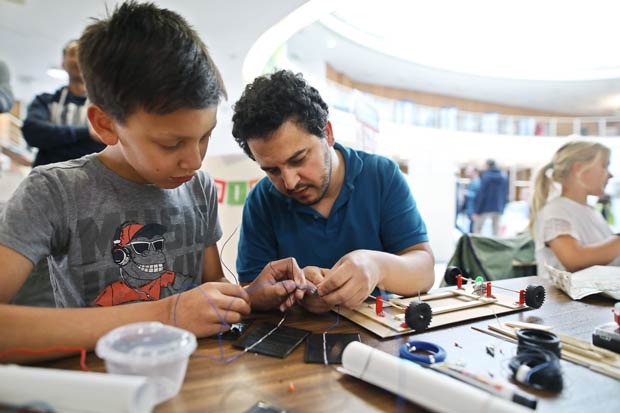 „Tüfteln erwünscht: In diesem Workshop konstruieren Besucher kleine solarbetriebene Fahrzeuge.“