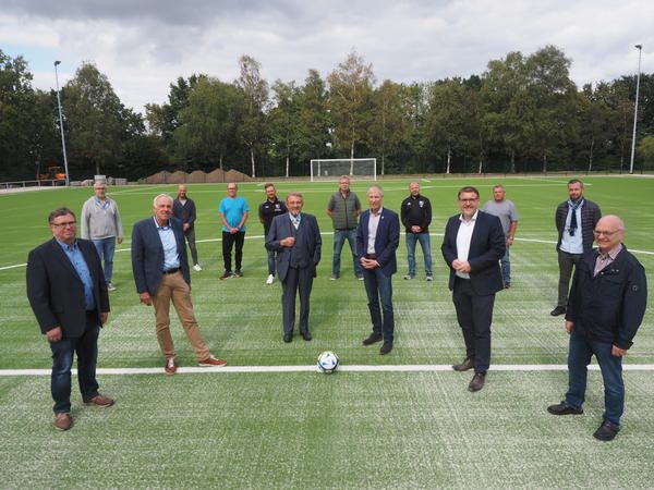 Symbolischer Anstoß auf dem neuen Grün: Sponsor Paul Gauselmann (vorn, 3. v. l.) mit (v.l.) Karl-Heinz Eikenhorst (Vorsitzender Fußballkreis Lübbecke), Lutz Freiberg (Kreis-Baudezernent), Bürgermeister Frank Haberbosch, Baudezernent Ingo Ellerkamp und Reinhold Wöstehoff (Vorsitzender Stadtsportverband Lübbecke) sowie Vertretern der Fußball spielenden Vereine (Hintergrund).Foto: Stadt Lübbecke